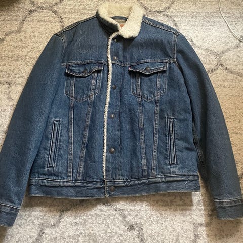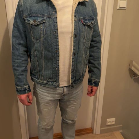 Levi's denimjakke for herre i størrelse M. Jakken er i blå denim med krage og fôr i mykt materiale på innsiden, som gir ekstra varme. Klassisk jeansjakke-design med knappelukking og flere lommer foran. Passer som ytterjakke i overgangssesonger eller på kjølige dager.