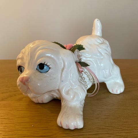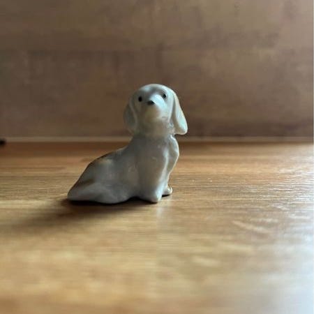 Keramisk hundefigur i hvit farge med rød hatt og gule ører. Figuren har teksten «Love» på forsiden. Egner seg som pyntegjenstand på bord, hylle eller i barnerom. Passer til innendørs dekorasjon og som del av en samling med figurer eller ornamenter.