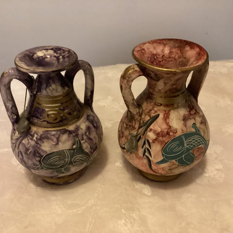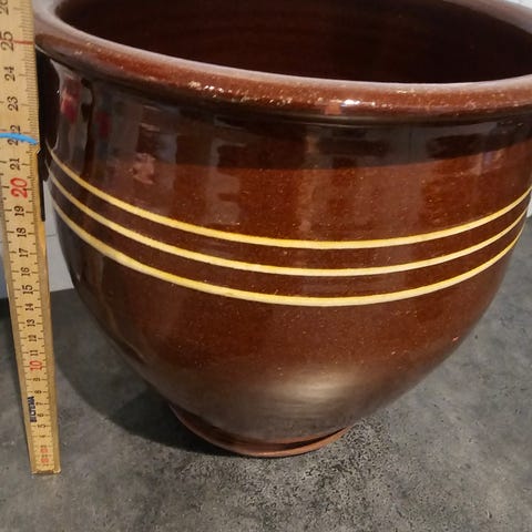 3 eldre keramikkrukker til salgs. Den til høyre ser ut til være limt en gang. Elles flotte . Kr 200 pr stk