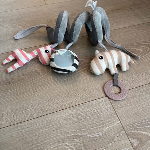 Done by Deer aktivitetsleke spiral i grå farge. Spiralformen gjør at leken kan festes rundt f.eks. bilstolhåndtak, sprinkelseng eller vognbøyle. Leken har flere hengende elementer, blant annet myke figurer og speil, som gir visuell og taktil stimulering for baby. Egnet som babyleke fra tidlig alder.