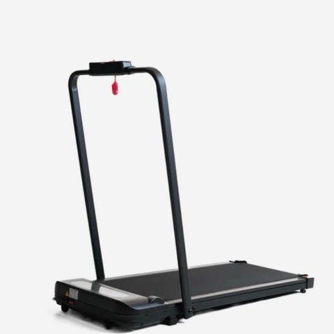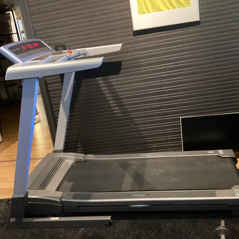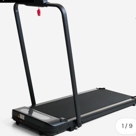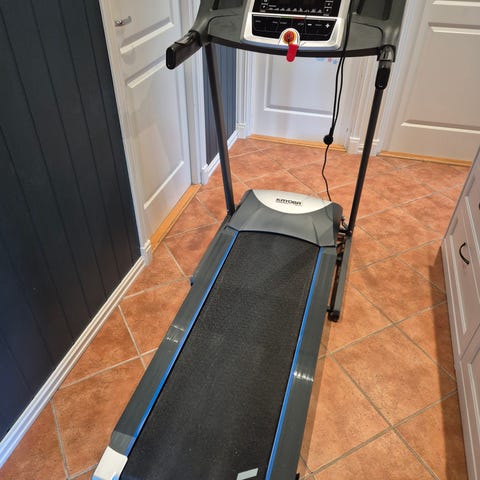 Tredemølle med sammenleggbar sikkerhetsbøyle og digitalt display i front. Displayet viser grunnleggende treningsdata som tid, hastighet og distanse.