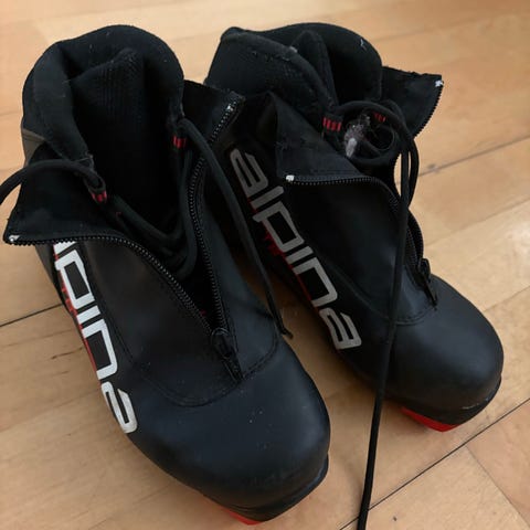 Alpina langrennssko - str 36. Farge: svart og sølv, med røde detaljer. Skoene har glidelås og stramming foran for å holde snø ute og gi bedre passform.