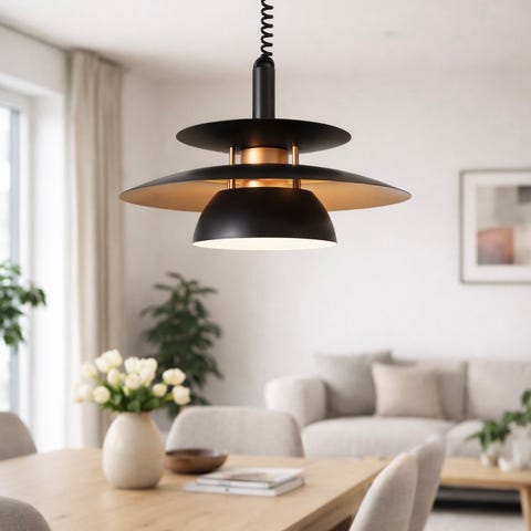 De kan henges opp med eller uten skjerm. Skjermen er i sort metall som tres på fra oversiden.