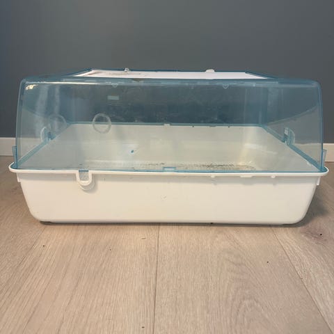 Buret åpnes på toppen så det er enkelt å komme til hele buret. Kurven på toppen er fylt med utstyr.