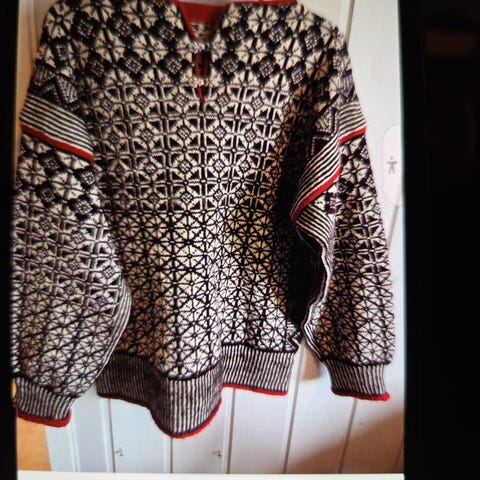 Tilstand? Pent brukt. Noe tovet/lodden på utsatte områder. Mye møster så forbehold om uoppdagede løse tråder/nupper. Antar den er uvasket, har selv kun luftet og steamet etter bruk. Pris justert.