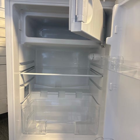 Kombiskapet har kjøledel øverst og frysedel nederst, med separate dører og vertikale håndtak. Innvendig finnes elektronisk betjeningspanel for innstilling av temperatur og funksjoner. Skapet er frittstående og tilpasset plassering på kjøkkengulv inntil benk og skap.