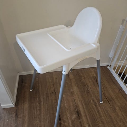 Barnestol med brett i hvit plast. Stolen har avtagbart spisebrett og fotstøtte, samt enkel sitteenhet med ryggstøtte. Egnet for små barn som trenger støtte ved måltider. Lett å tørke av og holde ren, og kan brukes ved spisebord eller på kjøkken.