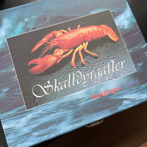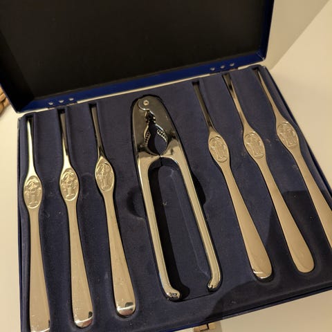 Hardanger Bestikk skalldyrsett i metall. Settet består av en nøtteknekker/skalldyrknekker og 5 gafler til servering og rensing av skalldyr. Leveres i eske med formtilpasset innlegg som holder delene på plass. Egnet til servering og spising av blant annet reker, krabbe og hummer. Selges for 250 kr.