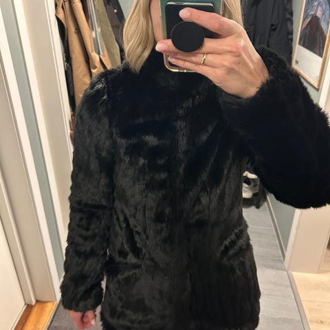Eldre falsk pels. Svart med litt brunskjær. Er romslig i str. det står S på den, jeg bruker vanligvis L. Litt kort på armene for meg, jeg er 174 cm.