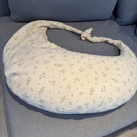 Ammepute i blå farge. Puten har knytefunksjon i enden slik at den kan justeres og holdes på plass rundt kroppen. Egner seg til støtte ved amming eller flaskemating, og kan også brukes som støttepute for både barn og voksen ved hvile eller sitting.
