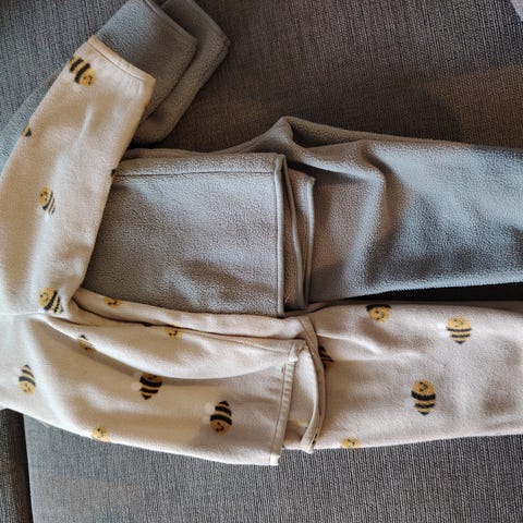 To flotte barneklede, eitt av fleece. Varme og komfortable, vi brukte dei med glede, men dessverre har dei blitt for små for oss. Passar for alder 12–18 månader. Tilstanden er svært god, fleeceplagget er som nytt og vart berre brukt i barnehagen til soving.