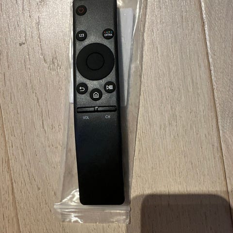 fjernkontroll i svart farge. Fjernkontrollen har egne knapper for blant annet Netflix, Samsung TV Plus, Disney+ og Prime Video, samt standard navigasjons- og volumknapper. Samsung TV-modeller