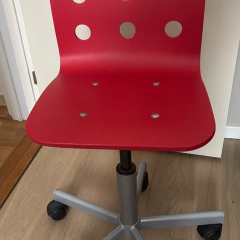 IKEA barnestol i hvit plast med rygg og sete med runde hull. Stolen har understell i metall med hjul og høydejustering. Egnet som arbeids- eller skrivebordsstol for barn.