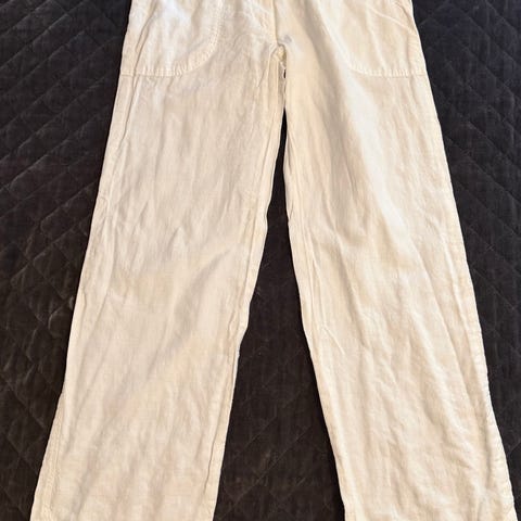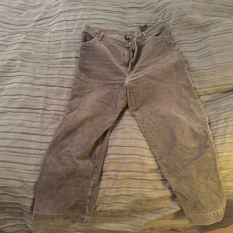 Monki bukser i hvit cordfløyel for dame i størrelse 44. Buksen har klassisk linning med beltehemper, glidelås og knapp i front. Skrålommer foran og innfelte lommer bak. Cordfløyelsstoffet har tydelig struktur og gir et mykt uttrykk. Passer til hverdagsbruk og kan kombineres med ulike topper og gensere.
