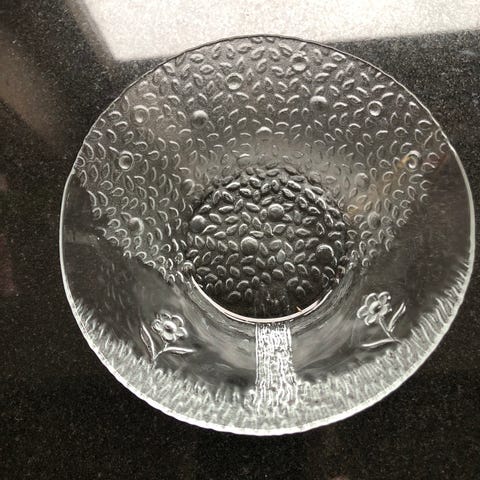 Serveringsfar som passer til Arcoroc Aspen Leaf (ser ikke brand navn på fattet). Noen små skader på kanten (nesten usynlig) og noen riper fra bestikk. Ø 31,7cm. H 1,5cm.