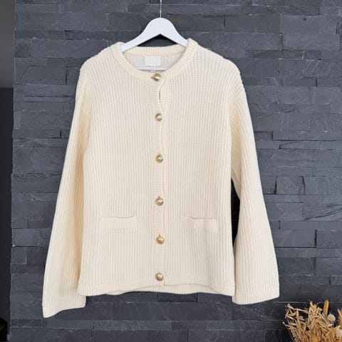 H&M cardigan vest for dame i størrelse M. Strikket modell uten ermer i mørk blå bomull. V-hals og knappestolpe med dekorative knapper foran. Ribbestrikket struktur i hele plagget og ribbekant nederst. Egnet som et lag over topp eller skjorte til hverdagsbruk.