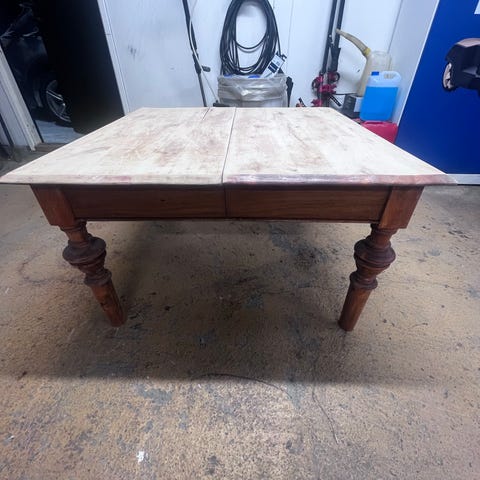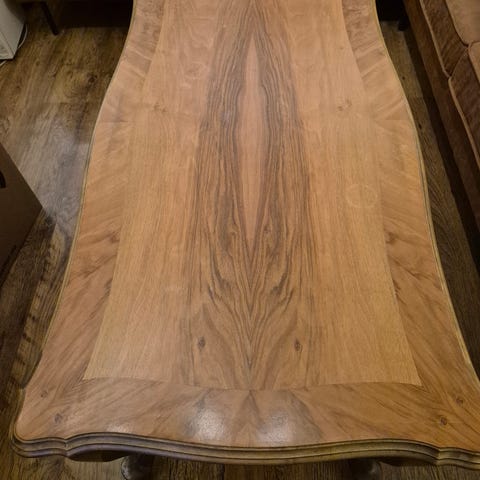 Til salgs er et gammelt, men vakkert salongbord i mørkebrun farge.