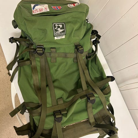 Norrøna Sport Hadengla tursekk med volum på 100 liter i grønn farge.sidelommene rommer 20 liter.ørlite hull i den ene,kan lett fikses.