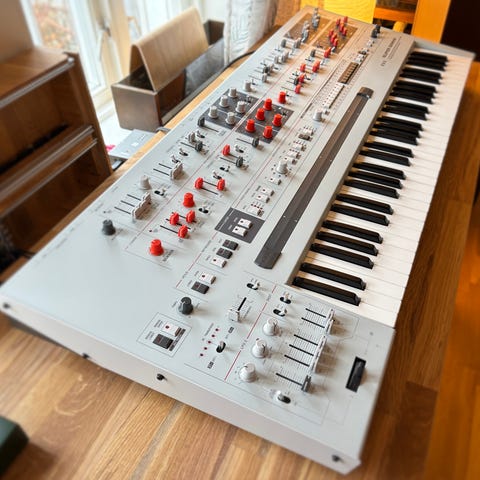 Sequential Circuits Prophet‑600 oppgradert med GliGli og nye tresider. Synthen fremstår som pen og fungerer som den skal.
