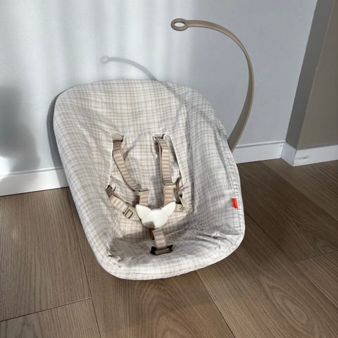 Stokke barnestol. Barnestol med sele, egnet for små barn. Nøytral, lys tekstilfarge med rutemønster. Rutemøstret er et ekstra trekk, under er det beige.