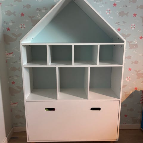 Stuva skap med rosa dører og en hylle inni. Ben er montert, men de lave knottene kan medfølge om det trengs. 60cm bredde, 50,5 cm dybde, 65 cm høyde uten ben, 75 cm med ben.