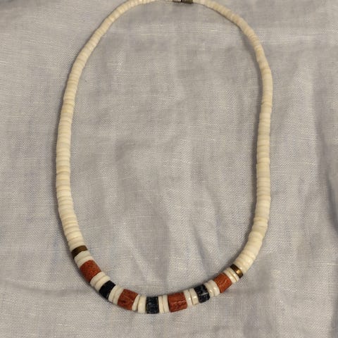 TRENDHIM smykke for unisex med leddet kjede i skiveformede perler i naturtoner, hvitt og turkis. Smykket har metallkomponenter i stål, inkludert karabinlås og forlengerlenke for justerbar lengde. Egnet til daglig bruk eller som et enkelt tilbehør til ulike antrekk.