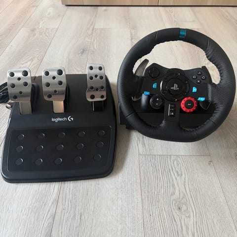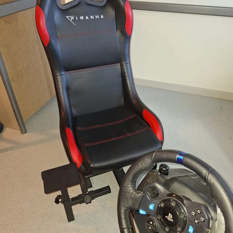 Selger et komplett racing setup med Logitech G29 ratt, pedaler og racing sete.