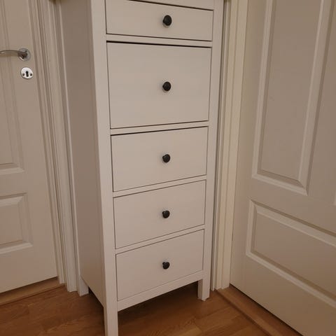 Jeg selge en brukt hemnes kommode i bra stand ingen skade noen veldig små bruksmerker ( som er ikke mye ) kommoden ble kjøpt i januar 2025 den er heltre og hvit beiset ellers så er den i fint stand