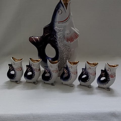 Høyde: karaffel 23 cm, fisk 7 cm.