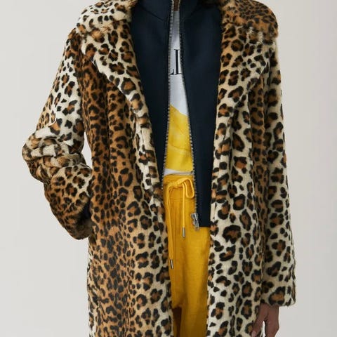 Ganni kåpe i leopardmønstret flerfarget stoff for dame i størrelse 38. Ytterstoff i polyester med glatt, ensfarget fôr på innsiden. Kåpen har rett fasong og rekker omtrent til over kneet, avhengig av høyde. Passer som ytterplagg i overgangssesonger eller som et markert plagg over annet antrekk.