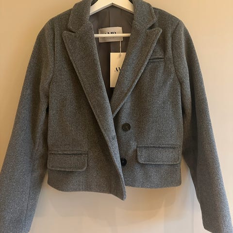 Grå blazer i ullmiks fra Twist & Tango. Den er kun prøvd på, og aldri brukt da den ble for stor for meg. Lappen ble tatt av.
