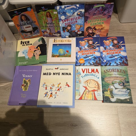 Bokpakke med brukte bøker kjøpt i barnehagen som skulle legges ned. De er godt brukt, men har fortsatt lang levetid igjen!