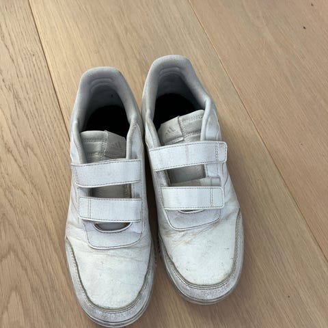 Adidas joggesko for barn i størrelse 30, unisex-modell. Skoene er hovedsakelig hvite med rosa Adidas-striper på sidene og grå detaljer rundt hæl og åpning. Overdelen er i syntetisk materiale med teksturert overflate og snøring foran. Yttersålen har mønster for grep og Adidas-logo under. Egner seg til hverdagsbruk og lett aktivitet for barn.