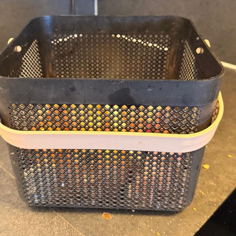 Kurv i plast i svart farge. Oval form med to bærehåndtak som kan legges ned. Kurven har perforerte sider som gir lufting. Egnet til oppbevaring av klær, leker eller annet utstyr i hjemmet. Størrelsen fremgår av bildet med målestokk (omtrentlig lengde kan avleses der).