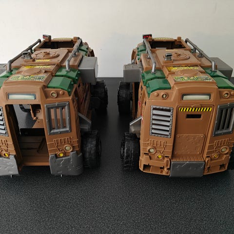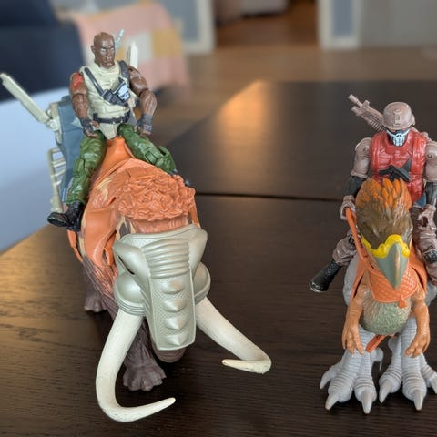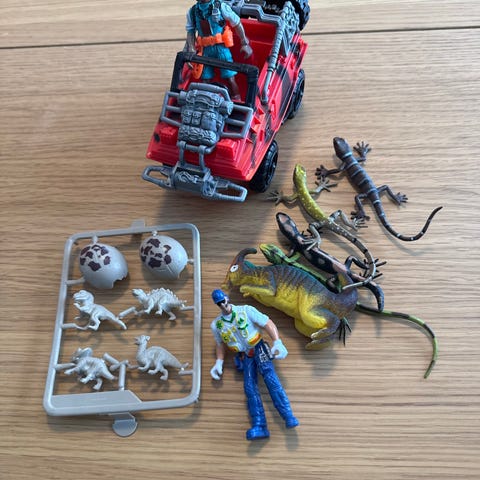 Sett med actionfigurer, bil, dinosaur og busker.