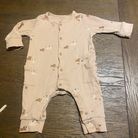 H&M baby heldress for jente i størrelse 68. Heldressen er beige med dyremotiv og er laget av bomull. Den har hette og glidelås foran som går nedover kroppen for enkel av- og påkledning. Foten og hender kan lukkes. Passer til bruk som ytterplagg eller kosedress for baby.