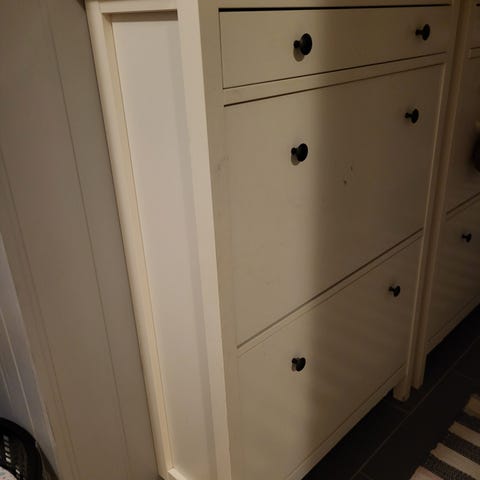 Selger pent brukt skoskap fra HEMNES-serien til IKEA da det dessverre ikke blir tatt i bruk. Det er oppgradert med knotter i krom. Pent brukt, ingen synlige merker eller skader.