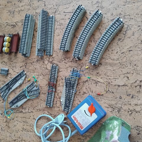 Modelljernbane. Togsett som inkluderer et lokomotiv, noen godsvogner og passasjervogner, 16 rette og 23 buede skinner, 2 elektriske penser, (høyre og venstre), sporkryss og en stoppbukk. Transformator.