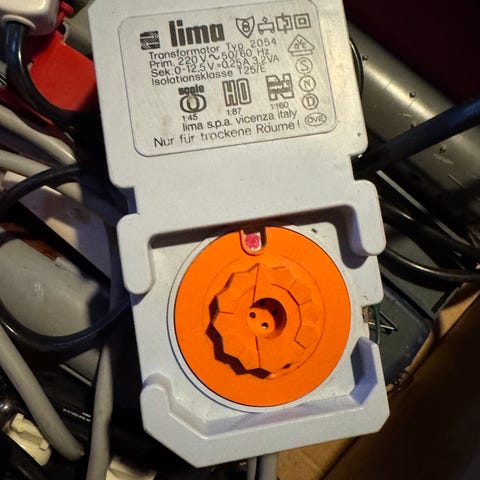Modelljernbane. Skinner, lokomotiv, vogner hus og trafo