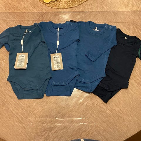 3 bodyer i ull i størrelse 56. To bodyer fra merket Janus og en fra merket WoolLand. Bodyen fra WoolLand er en omslagsbody med elgmotiv bak.