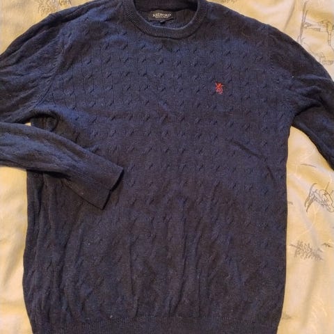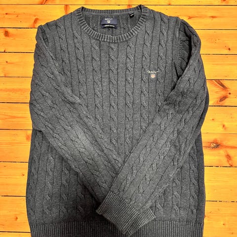 Gant genser for herre i størrelse M. Genseren er svart og strikket i bomull med flettestruktur. Rund hals med ribbestrikket kant, samt ribb nederst og på ermene. Egner seg til hverdagsbruk og kan brukes alene eller over skjorte eller T-skjorte.