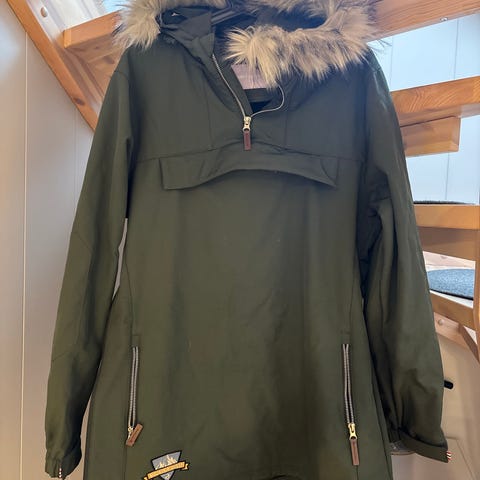 En lyseblå anorakk med lommer på siden og en stor lomme på brystet. Hette med pels som som kan tas av
