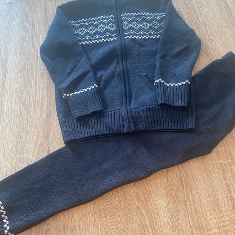 Ullsettet består av genser/jakke med glidelås og bukse i samme farge. Overdelen har mønster øverst på bryst og rygg, samt ribbestrikkede kanter ved hals, ermer og nederkant. Buksen har elastisk linning og ribbestrikkede benkanter.