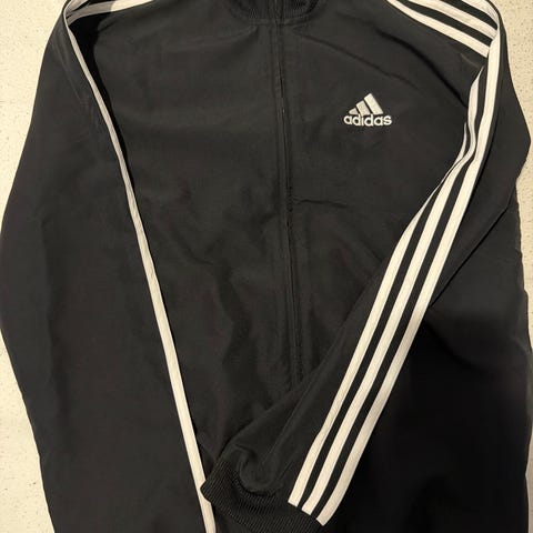 Adidas treningsjakke for barn i størrelse 164. Jakken er svart med hvite Adidas-striper langs ermene og hel glidelås i front. Den har høy krage, ribbestrikkede mansjetter og linning for bedre passform. Egnet til trening og fritidsbruk innen fitness og annen fysisk aktivitet.