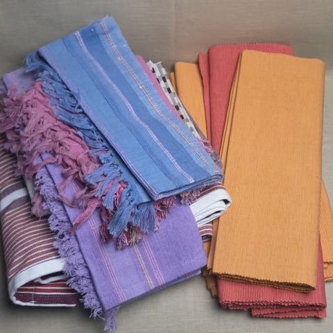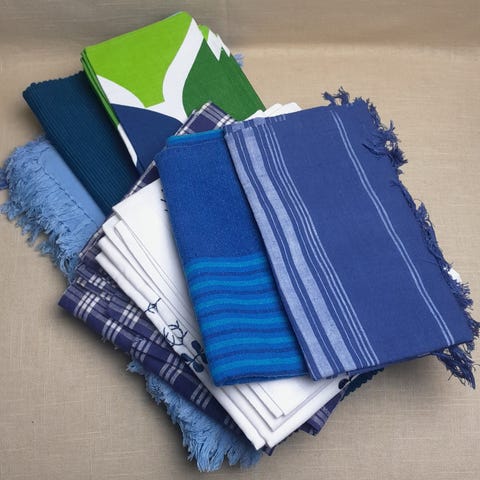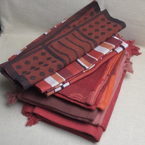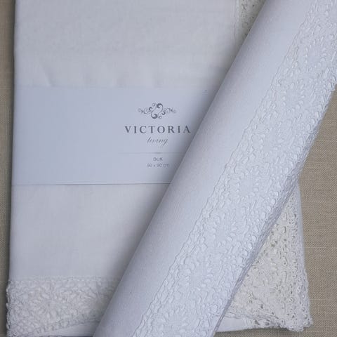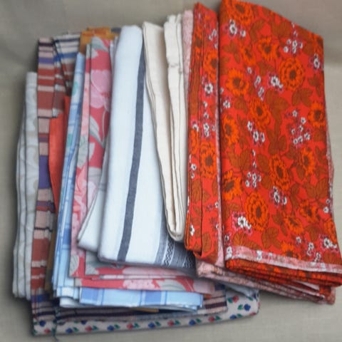 En stor duk, flere mellomstore og 90x90 duker noen brikker. Selges samlet
