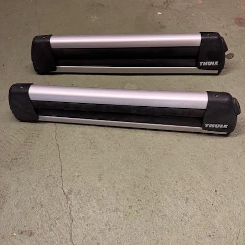 Thule skistativ med tilhørende lås og braketter. Se mål på bildene.