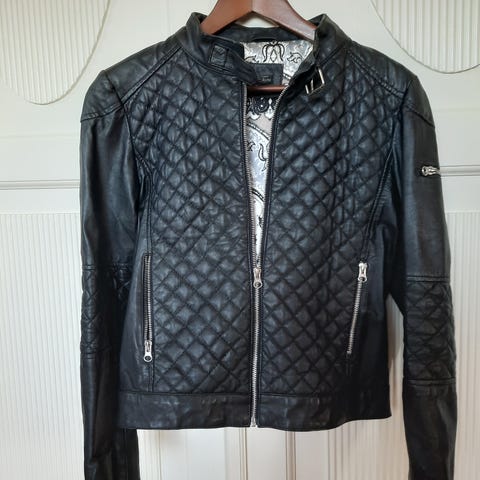 Tøff pen Barbour vårjakke/høst (relativt tynt fór) for dame i størrelse M. Vil si normal til liten M. Jakken har et vattert, quiltet mønster, fine detaljer, kul asymmetrisk glidlås på fremsiden og fototrykk på innsiden på ryggen.