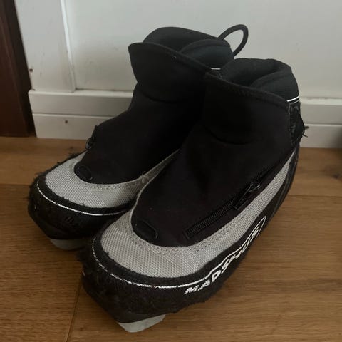 Madshus skisko i svart og grå farge. Modellen har snøring med beskyttende klaff over vristen og kraftig såle med feste for langrennsbinding. Skoene er egnet til bruk med langrennsski. Størrelse 34. Må hentes.
