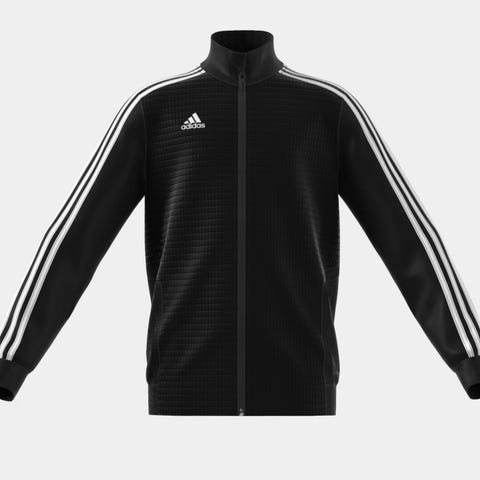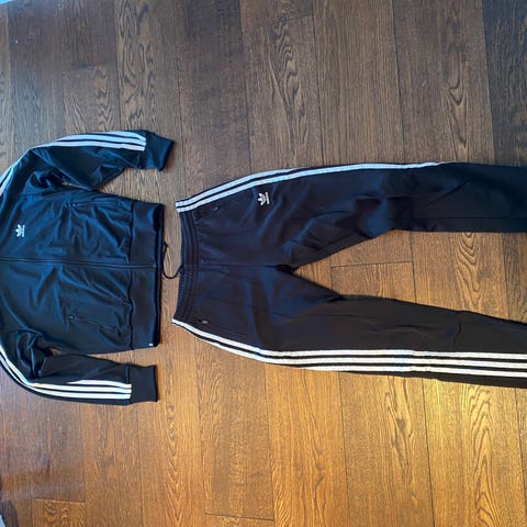 Adidas treningsdress for herre i størrelse S. Sett med jakke og bukse i svart farge med hvite striper langs ermene og bena. Jakken har glidelås i full lengde og ribbekanter ved ermer og nederkant. Buksen har strikk og snøring i livet samt ribbekanter nederst ved bena. Egnet til trening, fritid og hverdagsbruk.