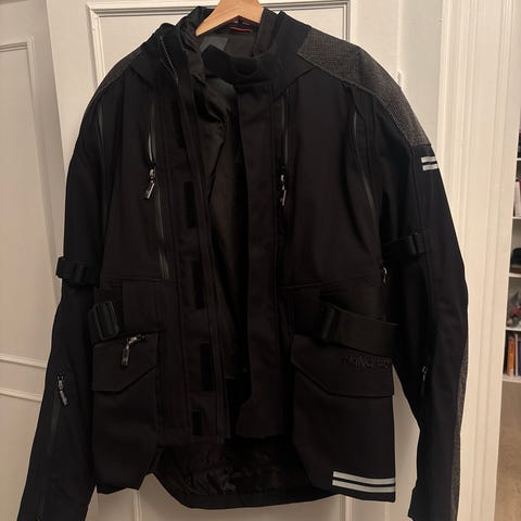 X motorsykkeljakke i svart farge, størrelse S. Jakken har glidelåslukking foran, flere lommer og justerbare stropper nederst for bedre passform. Innsiden er foret for økt komfort. Egnet som ytterjakke ved motorsykkelkjøring eller annen bruk der man ønsker en kort, funksjonell jakke med litt kraftigere materiale. Har også plate i ryggen.